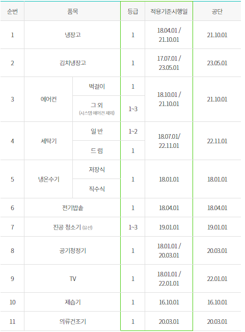 아래 표의 11개 품목 중 에너지소비효율 등급과 적용기준시행일 2가지 모두 충족하는 가전제품