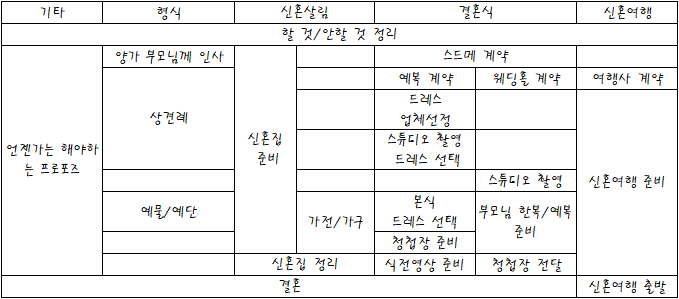결혼준비를 하기 위해서는 결혼이라는 일생일대의 이벤트가 어떤 요소로 구성되어 있는지 이해할 필요가 있습니다. 저도 한번뿐인 결혼이었지만 짧은 경험에서 이야기하자면 구성요소를 크게 아래와 같이 네가지로 나눌 수 있을 것 같습니다.