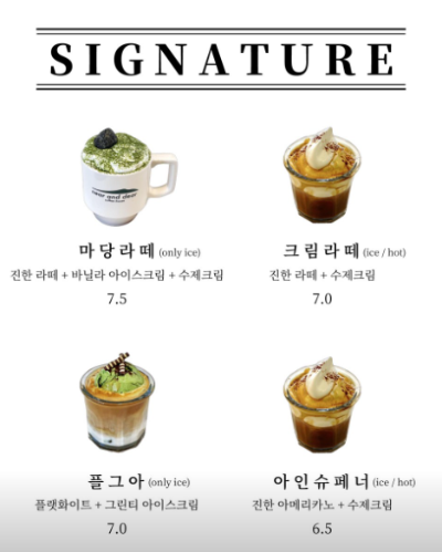 니어앤디어의 시그니처 음료는 아래와 같습니다. 마당라떼, 크림라떼, 플그아, 아인슈페너 인데요. 저는 아인슈페너를 마셨습니다. 니어앤디어에서는 스콘이나 쿠키도 함께 판매하는데 가격이나 맛이 좋은 편이었습니다.