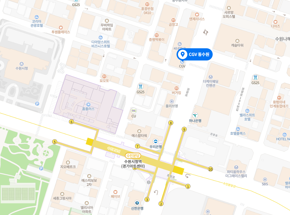 동수원 CGV 영화관 주소는 경기 수원시 팔달구 권광로 181 씨네파크 입니다. 영화관은 건물 7층(~10층)에 위치해 있습니다. 수원시청역 8번출구에서 약 100m 정도만 걸으면 도착입니다!