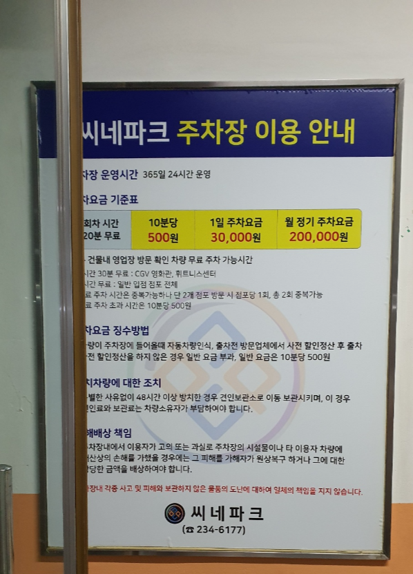 동수원 CGV 영화관은 해당 건물의 지하에 주차가 가능합니다. 건물 주차장 입구는 대로변이 아닌 골목쪽으로 진입하셔야 들어가실 수 있습니다. 영화관을 이용하시는 경우 3시간 30분이 무료이기 때문에 영화 관람시에는 주차비 걱정은 안해도 될 것 같습니다.