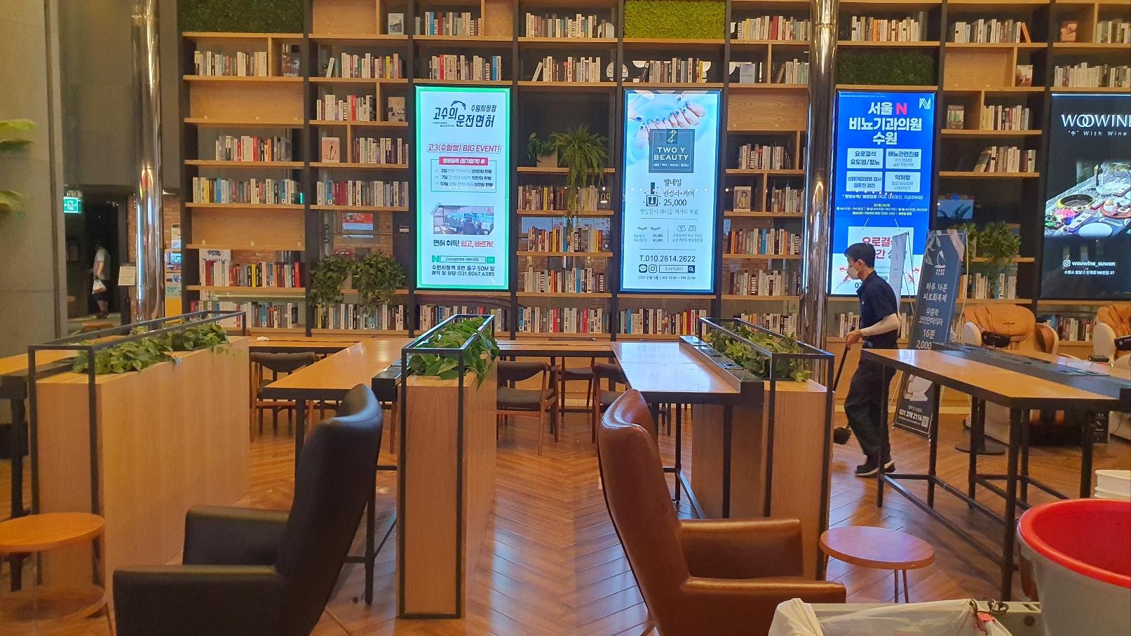 영화관 내부는 CGV 특유의 인테리어로 깔끔하게 잘 갖춰져 있습니다. 한쪽에는 영화를 기다리는 동안 이용할 수 있는 책과 독서 공간도 구성되어 있습니다. 7층 화장실은 엘레베이터에서 오른쪽에 있습니다.