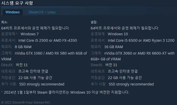 라스트에폭의 사양은 아래 표와 같습니다. 라스트에폭은 2019년부터 얼리액세스를 해서인지 게임에 요구되는 사양이 높은편은 아닙니다.