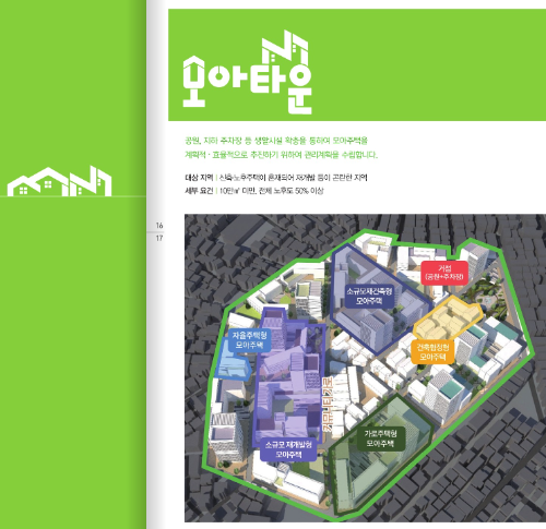 모아타운을 검토 시 간선도로를 중심으로 약 30만m^2 의 검토범위를 검토하여, 10만m^2의 모아타운 지역을 선정하고, 그 안에 최소 1.5천m^2의 모아주택 구성을 기본으로 합니다. 모아타운 계획수립의 주안점은 주요 가로활성화, 지역내 주차문제 해소, 공원 및 도로등 기반시설 확충, 공공역할 강화와 민간참여 유도 입니다.