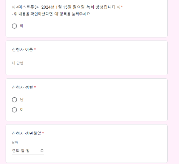 녹화 일정과 신청자 이름 및 성별, 생년월일을 잘 기입해주세요.