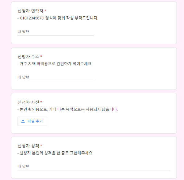 신청자 연락처와 주소, 신청자 성격을 적어주세요.