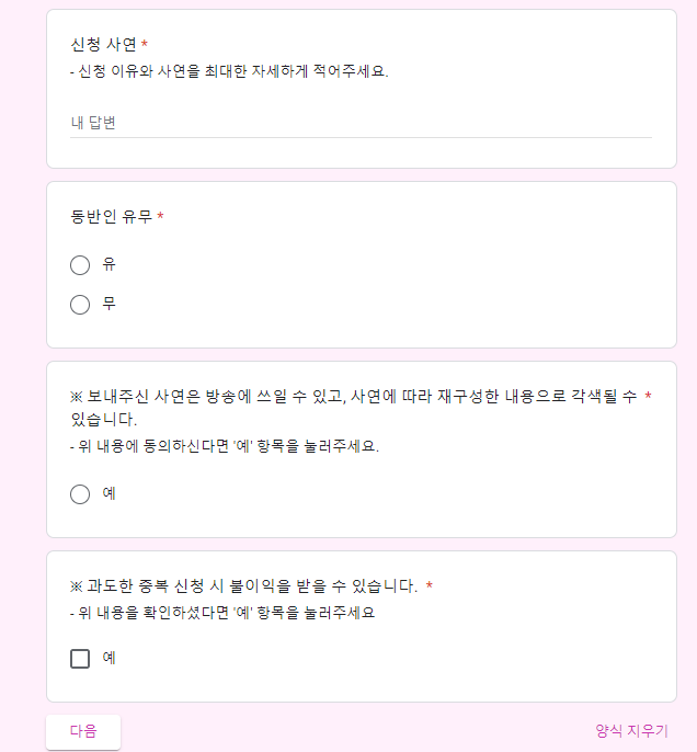마지막으로 신청 사연을 적어주시고, 동반인 유무 그리고 동의여부와 안내 내용 확인에 예를 누르신 뒤 다음 버튼을 누르시면 끝이 납니다.