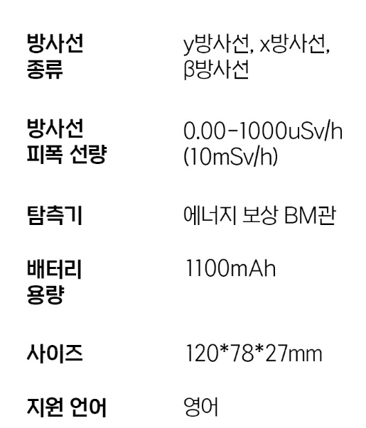 첫 번째로 추천드리는 제품은 제니스캔 방사능 측정기입니다. 제니스캔 방사능 측정기는 무게가 44g이고 크기도 10.5cm x 2.7 cm 정도로, 핸드폰보다 작아 휴대용으로 적격입니다. 완충시 10시간 연속 사용이 가능합니다. 알파, 베타, 감마 등 주요 방사능 검출이 가능하고, 누적 방사선 양이 일정 수준 이상이 되면 실시간으로 알람이 울리도록 되어있습니다. 제니스캔 방사선 측정기는 후쿠시마 인근에서 실제로 방사선 측정이 잘 되는지 테스트를 거쳤기 때문에 측정 신뢰도가 높은 제품이라 생각됩니다.
