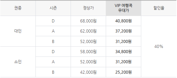 에버랜드 이용권의 정가는 아래 표와 같습니다.(ABCD 캘린더 확인하기)
