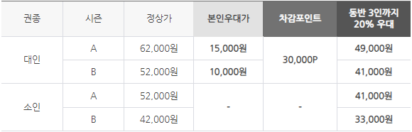비고 : 스마트예약 가능, ID별 1매 + 동반 3매까지 구매 가능(월 1회)