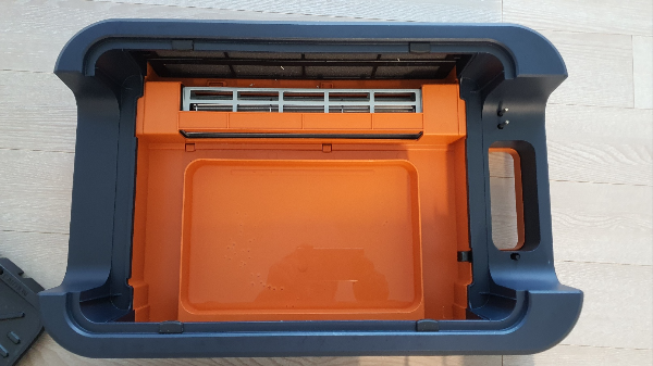 1. 밑면의 주황색 물받이 통에 물을 채운 뒤 다시 넣는다. 물을 채우기 전에 위치를 확정하고 물을 채워야합니다. 물을 채우고 그릴을 들고 이동했다간 팬에 물이 들어갈 수 있습니다.