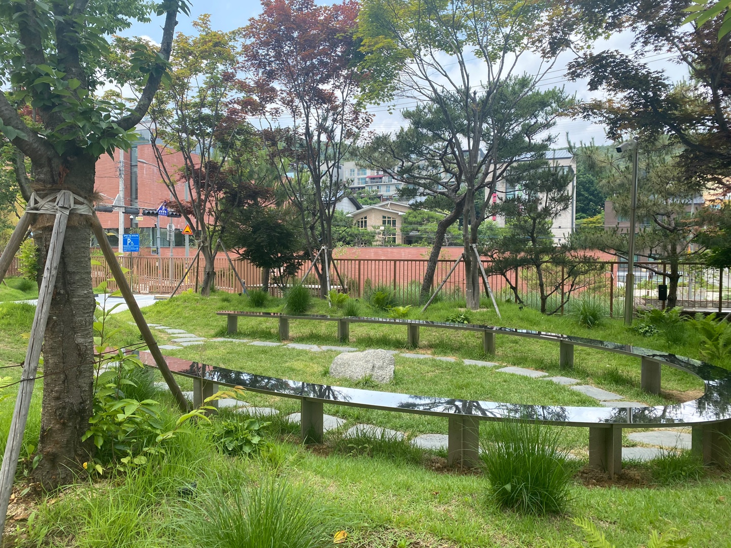 건물 전체적으로 공간을 꾸미는 것과 인테리어에 신경을 많이 썼습니다. 주차장에서 카페로 들어서는 입구쪽에는 깔끔한 간판과 대나무 계단이 맞이해주고, 건물 입구까지 가는 길이 굉장히 잘 꾸며져있습니다.