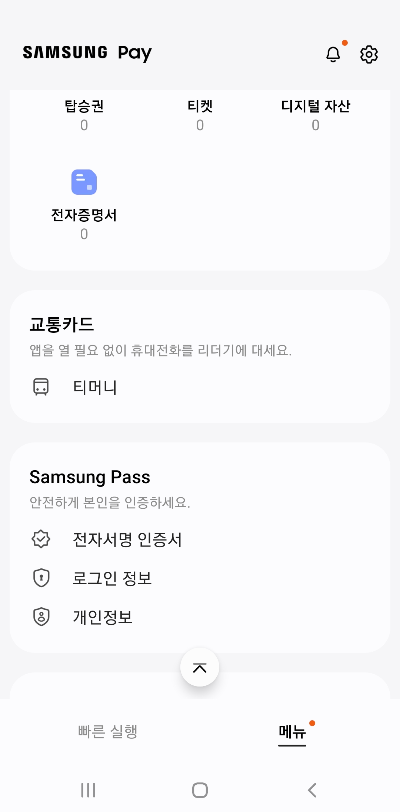 메뉴버튼을 누르면 아래 그림과 같이 삼성페이에 연결된 정보들이 나옵니다. 아래로 스크롤해 주면 교통카드 항목을 발견할 수 있습니다.