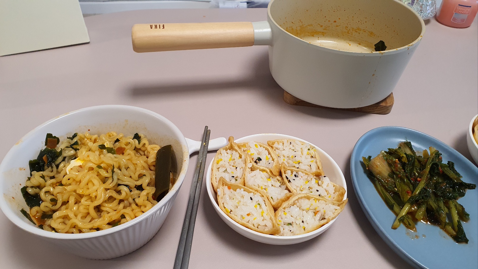 저는 만드는 과정이 굉장히 쉬운대신 유부만 먹기는 좀 심심해서 라면을 같이 먹었습니다. 라면은 실패..
