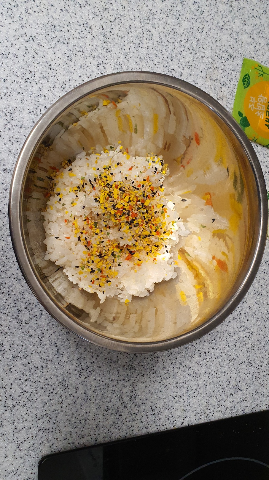 1. 밥을 큰 그릇에 옮겨담고 유부초밥 양념, 식초를 넣은 뒤 잘 섞어줍니다.