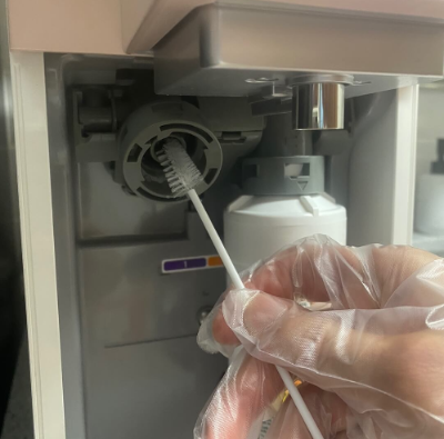 3. 기간이 지난 필터를 떼어낸 후 연결부위를 물을 묻힌 솔로 청소해 줍니다.